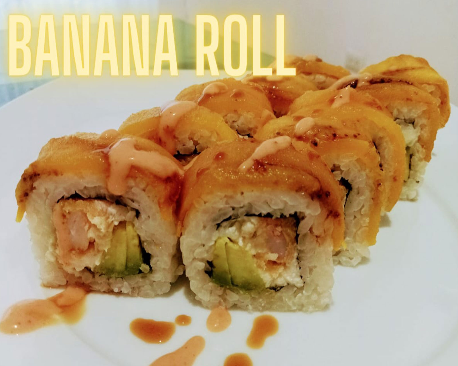Camarón capeado. aguacate y filadelfia, por dentro, plátano frito por fuera, suave salsa de anguila y chipotle encima.